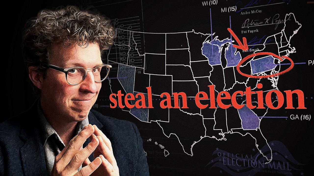 The video transcript explores the question: how feasible is it to steal the 2024 U.S. presidential election, focusing specifically on Pennsylvania, a crucial swing state. The host investigates various potential fraud methods including impersonating voters, voting multiple times, hacking voting machines, and manipulating mail-in ballots. To get an informed perspective, the host interviews Kathy Boockvar, former Secretary of the Commonwealth of Pennsylvania (a Democrat), and Seth Bluestein, a longtime Republican election official in Philadelphia.
